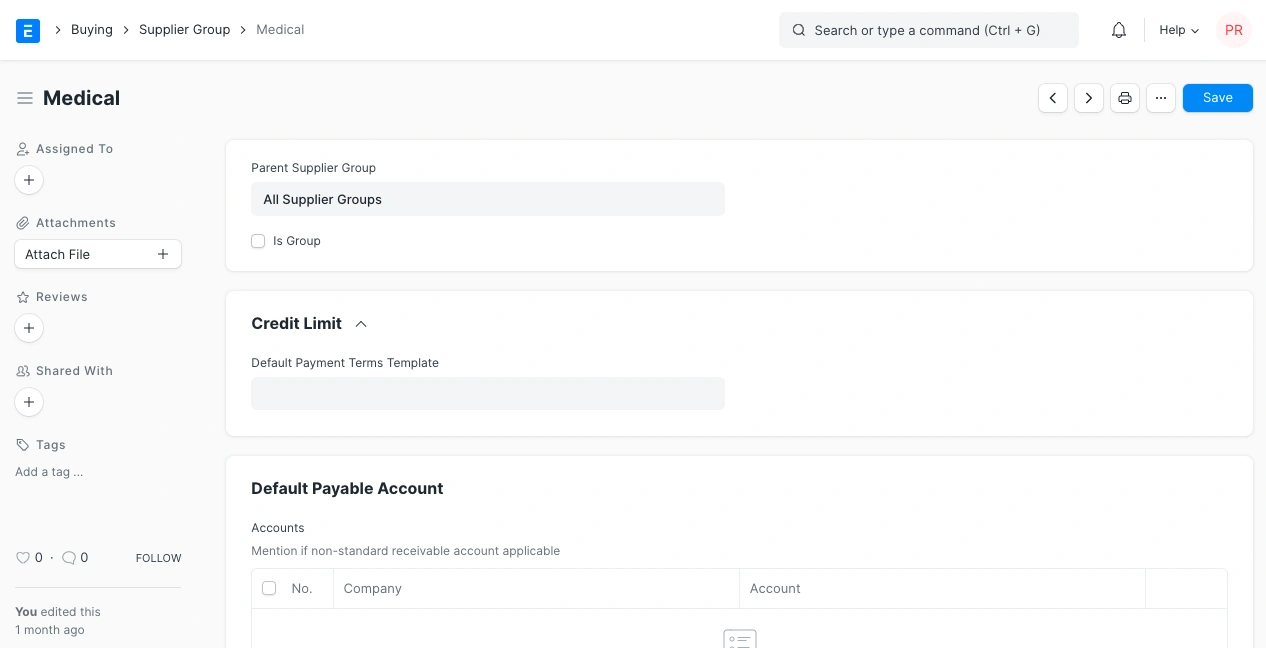 يتيح لك ERPNext إنشاء فئات خاصة بك للموردين. تُعرف هذه الفئات باسم "مجموعات الموردين". على سبيل المثال، إذا كان مورّدوك في الغالب شركات أدوية وموزعو السلع الاستهلاكية سريعة الدوران، يمكنك إنشاء مجموعة موردين جديدة لهم وتسميتها وفقًا لذلك.